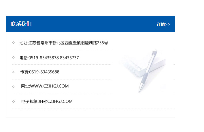 地址:常州市新北區友邦商務大廈1幢16、17層  電話:0519-85101652  傳真:0519-85112595  郵編:213022  網址:www.cz-jiayue_cn.shchangtian.com  郵箱:xiajifengaa@163.com